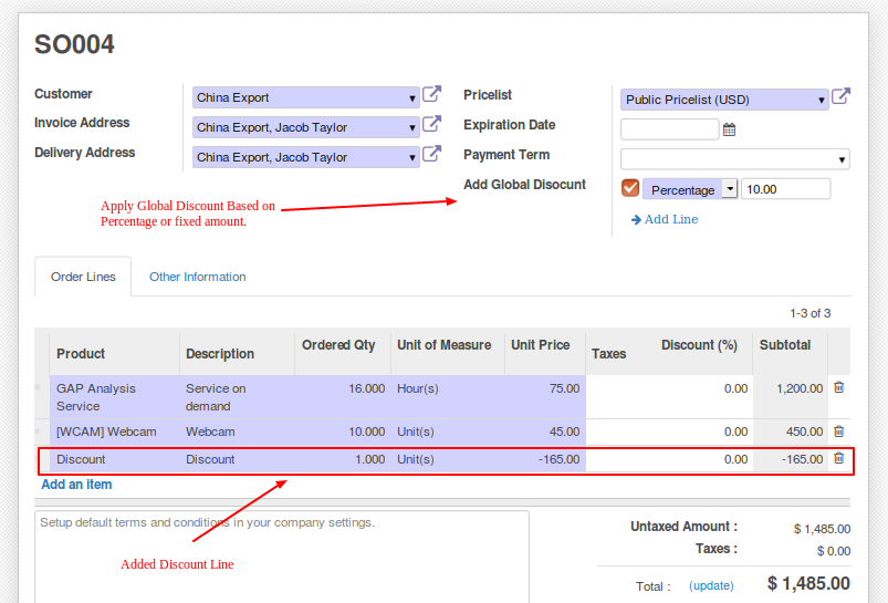 In many cases we need to give some global discount on order. To handle such cases we have added this module where you can add discounts based on percentage or fixed amount.